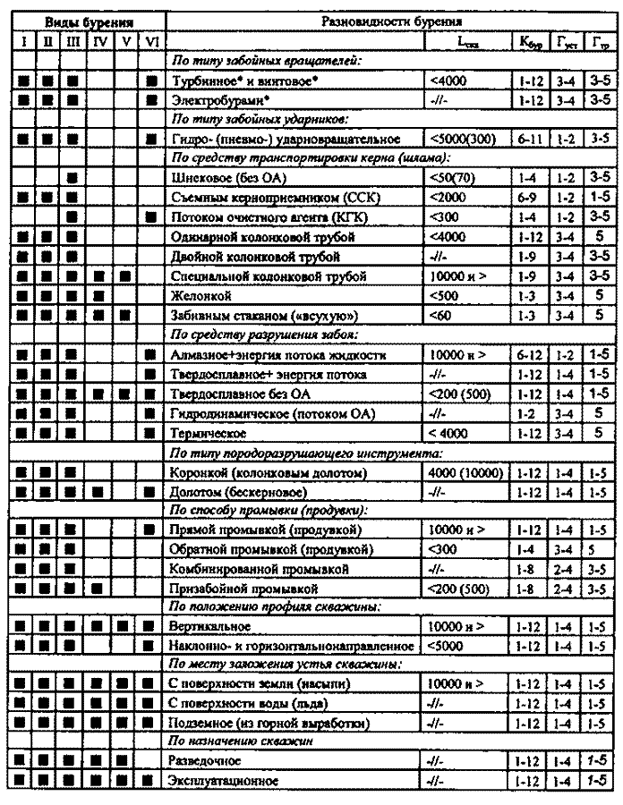 Таблица 4.2. Допустимые комбинации видов и разновидностей бурения и условия их применения